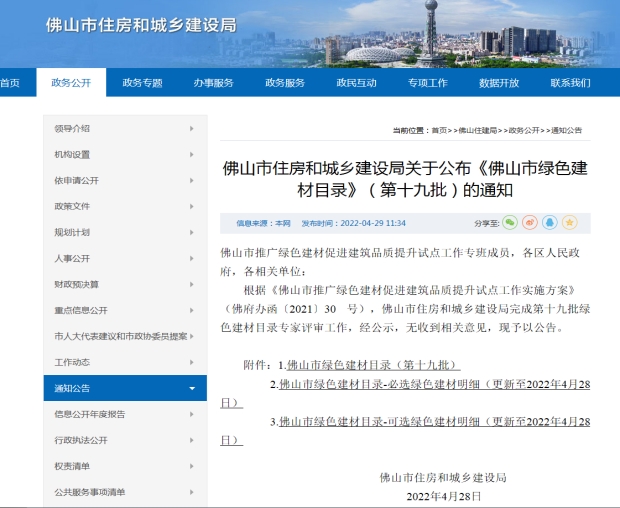 佛山市住房和城鄉(xiāng)建設(shè)局關(guān)于公布《佛山市綠色建材目錄》(第十九批)的通知