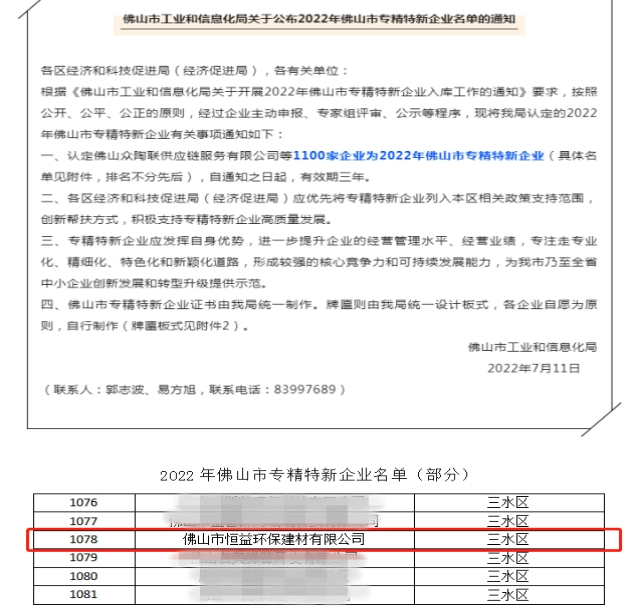 近日,佛山市工業(yè)和信息化局公布“2022年佛山市專精特新企業(yè)擬入庫名單”,佛山市恒益環(huán)保建材有限公司憑借在加氣塊行業(yè)領(lǐng)域“創(chuàng)新、專注、精進”的突出表現(xiàn)成功上榜,喜獲2022年佛山市“專精特新”企業(yè)榮譽。