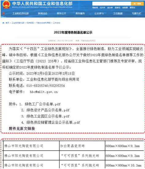 2月9日,由佛山市節(jié)能減排公司指導(dǎo)申報(bào)的佛山市陽(yáng)光陶瓷有限公司三款綠色設(shè)計(jì)陶瓷產(chǎn)品入選工信部2022年度綠色制造名單。