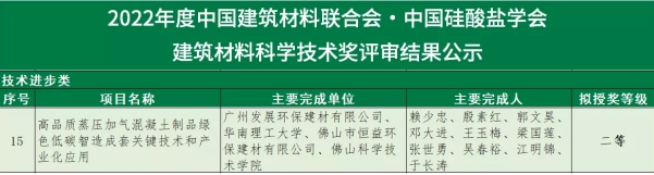 近日,“2022年度中國建筑材料聯(lián)合會?中國硅酸鹽學會建筑材料科學技術獎”公示了評審結果,恒益環(huán)保建材公司與廣州發(fā)展環(huán)保建材、華南理工大學、佛山科學技術學院共同參與完成的《高品質蒸壓加氣混凝土制品綠色低碳智造成套關鍵技術和產業(yè)化應用》項目榮獲建筑材料科學技術獎技術進步類二等獎!