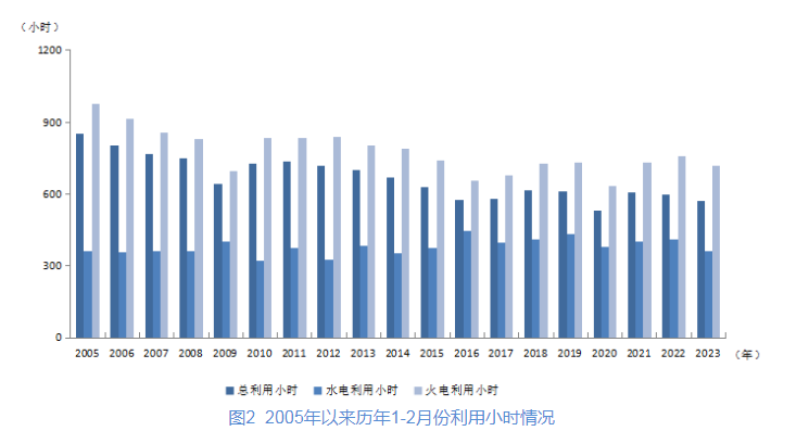 1-2月份,全國發(fā)電設(shè)備累計平均利用小時569小時,比上年同期減少28小時。
