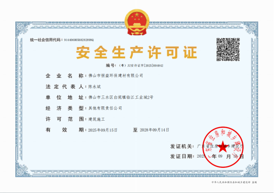 9月15日,佛山電建集團(tuán)有限公司下屬企業(yè)佛山市恒益環(huán)保建材有限公司(簡(jiǎn)稱:環(huán)保建材公司)獲得住房和城鄉(xiāng)建設(shè)廳頒發(fā)的建筑施工類安全生產(chǎn)許可證。目前,環(huán)保建材公司已擁有“建筑業(yè)企業(yè)資質(zhì)證書(施工勞務(wù))”和“安全生產(chǎn)許可證”等重要資質(zhì),不僅說明了環(huán)保建材公司具備相應(yīng)的專業(yè)資質(zhì)與能力,也是環(huán)保建材公司技能水平提升的重要體現(xiàn),為其服務(wù)業(yè)務(wù)提供了更堅(jiān)實(shí)的支撐。